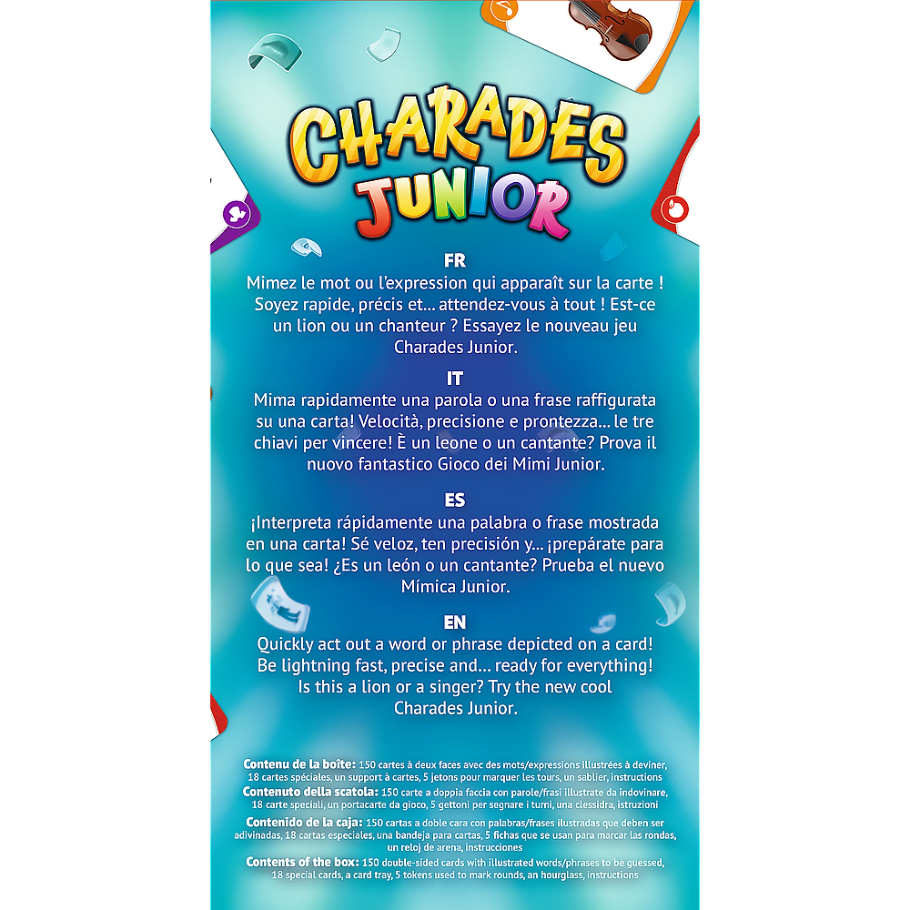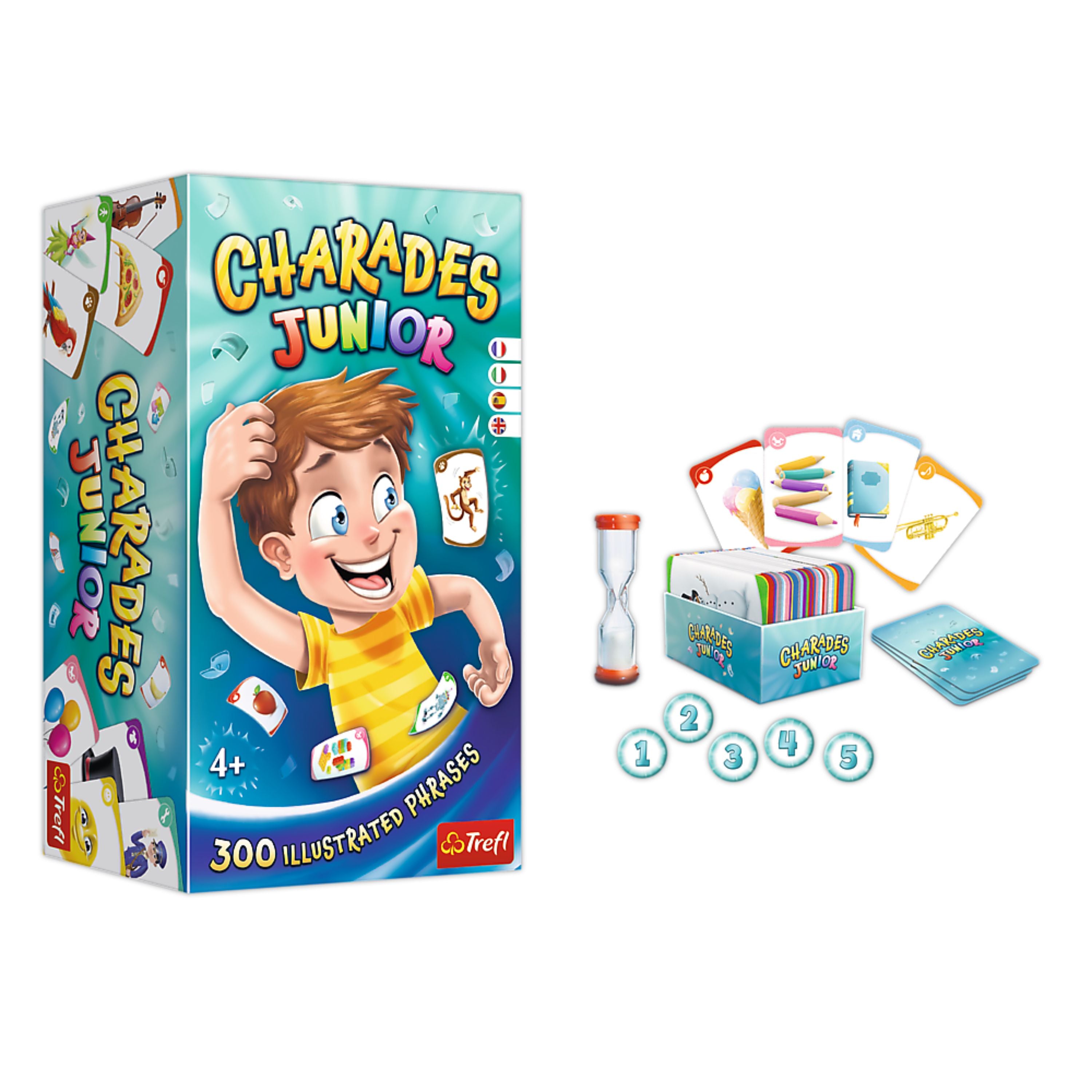 Charades Junior is a dynamic game for the whole family that guarantees laughter and fun. The clear and colorful images on the cards make the game easier but do not suggest a single answer. Each team has three of six special cards that temporarily change the game's rules. The hourglass limits the lap time to two minutes, making the game dynamic and exciting. Will your team guess more passwords than your opponents?